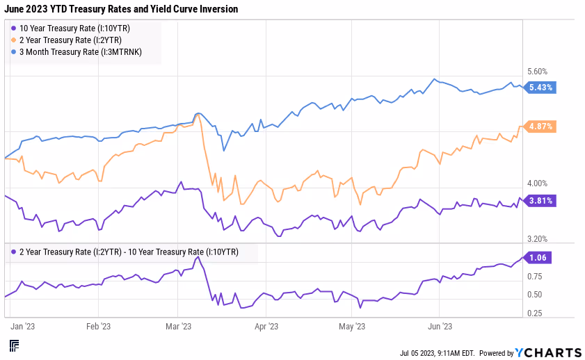 The Federal Reserve raised the Federal Funds rates 0.75% in the first half of the year to a target of 5.25%, as it continues to focus on its battle to lower inflation. We saw 0.25% increases in February, March, and May – while skipping an increase in June. Federal Reserve officials in public statements since the June meeting have indicated that the Fed is likely to raise interest rates 0.50% more this year, with an expected increase of 0.25% at the July 26th meeting. Federal Reserve officials have stated that the Fed’s price stability mandate is more important than its employment mandate until inflation returns to its target, even if high interest rates lead to a recession.