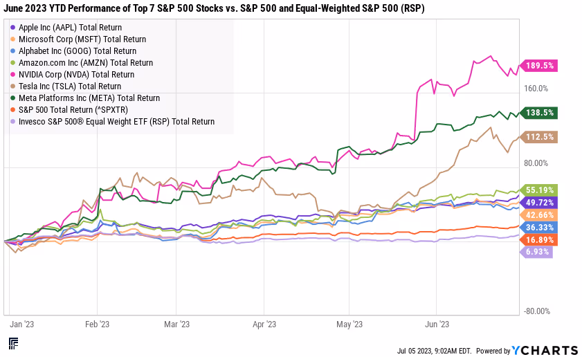 The first chart of broad index returns does not fully communicate how narrow the returns have been in the U.S. stock market. The top seven stocks have contributed virtually all of the performance of the S&P 500 through June. Triple-digit returns from NVIDIA, Meta Platforms, and Tesla, and returns of 36% to 55% from Alphabet, Microsoft, Apple, and Amazon have fueled the S&P 500’s return. Technology stocks, particularly ones with exposure to generative AI, have captured much of the market’s attention. In contrast, the Equal-Weighted S&P 500 Index had a return of only 6.9% for the first half of the year, versus the S&P 500 Index return of 16.9%. The above chart illustrates how dramatic the returns have been for these seven stocks this year.