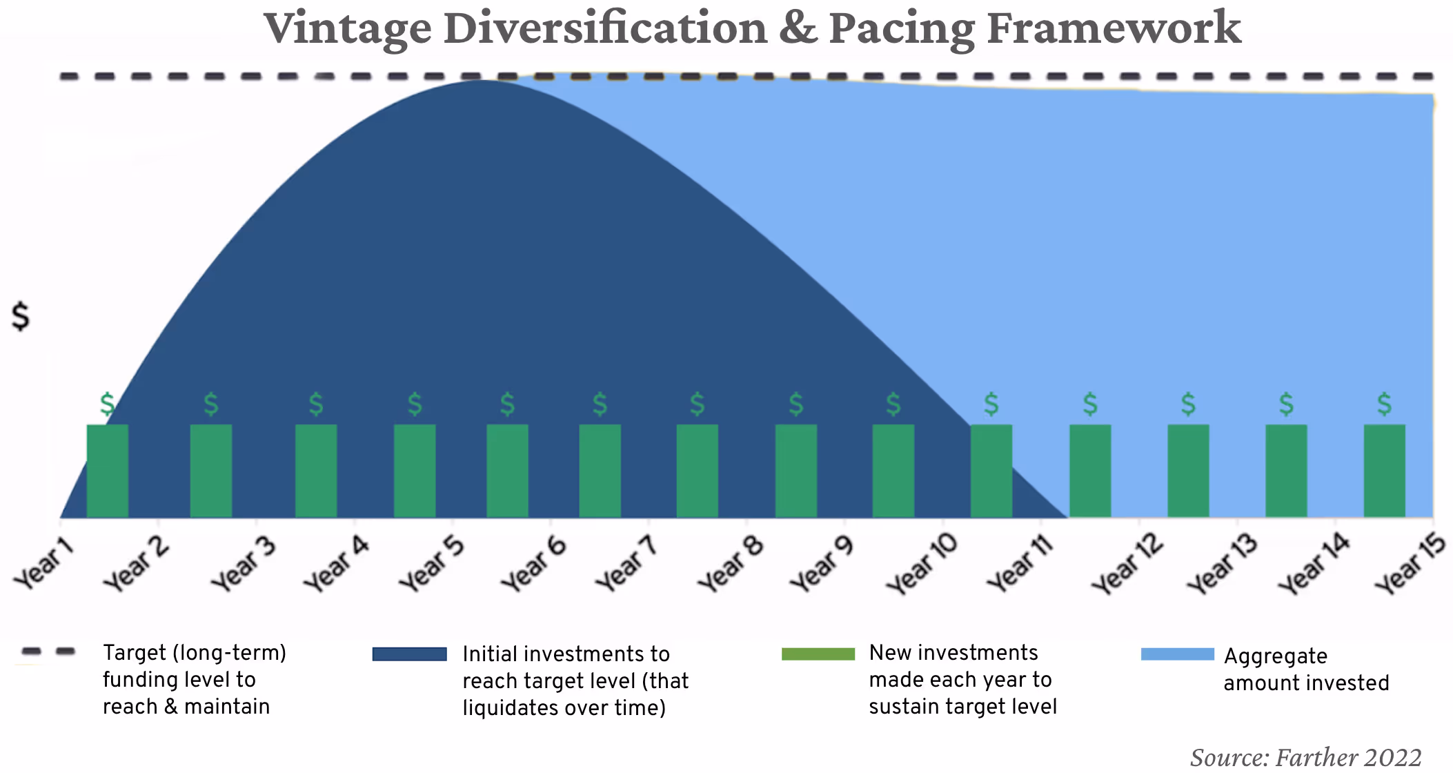 Steady and methodical private investment over multiple years is known as commitment pacing. Paving your investments allow for diversification across multiple fund managers, investment strategies, and annual vintage years. Over time as funds are liquidated these monies can be reinvested into new funds. The chart below depicts how commitment pacing works over the long run. Investors should set a target investment level for private capital (either a dollar amount or a percentage of the total portfolio) and invest incremental amounts annually to reach the target.