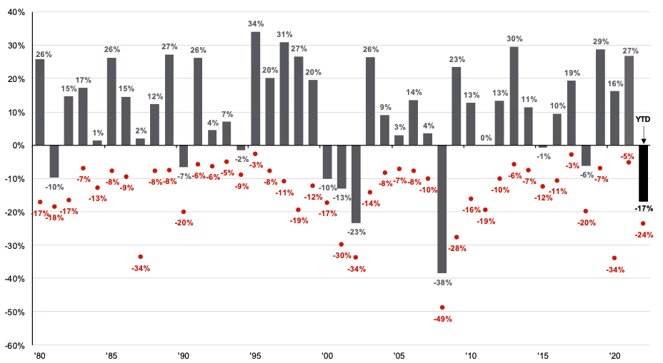 Returns are based on price index only and do not include dividends. Intra-year drops refers to the largest market drops from a peak to a trough during the year. For illustrative purposes only. Returns shown are calendar year returns from 1980 to 2021, over which time period the average annual return was 9.4%.