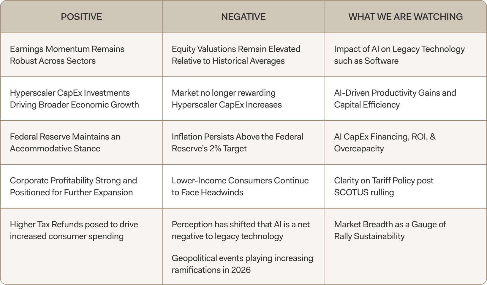 Each of these updates reflects what we outlined in our 2026 market outlook: We expect 2026 to continue to be a year of uncertainty which will likely continue to drive heightened volatility in the markets. Diversified portfolios are built for uncertain times like this. Over the past several months, we have advocated for more defensive positioning.