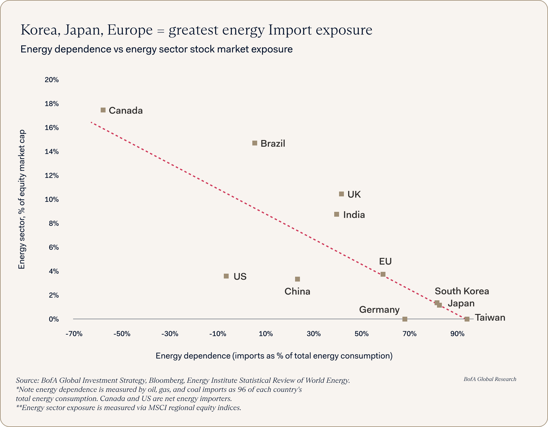 We find the below chart by BofA Global research particularly interesting, illustrating that South Korea, Japan, and Taiwan are most sensitive to energy dependence. As US oil production has roughly doubled to 13 million barrels per day over the past 25 years, the US economy has become meaningfully less sensitive to oil price spikes.