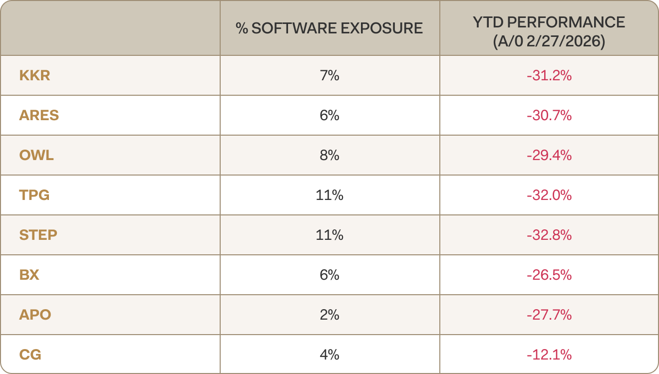 The risk is not uniform. Some managers have meaningful exposure to software refinancings at potentially unfavorable terms, while others are less exposed. We believe the indiscriminate nature of recent selling may ultimately create opportunities in select private equity managers and their respective strategies.