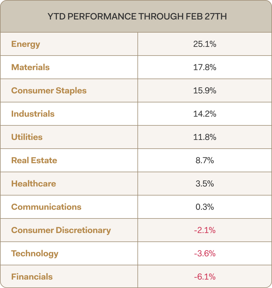In what feels like a market homage to the defensive dominance of the Seattle Seahawks in their Super Bowl run, leadership has rotated. Technology and communications — last year’s leaders — have lagged year-to-date, while traditionally defensive sectors such as Utilities and Consumer Staples have outperformed. Energy remains the strongest sector, driven by geopolitical concerns.