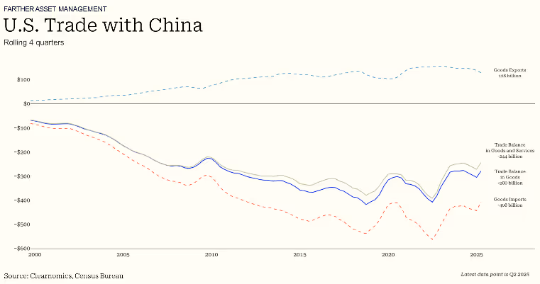 Discussions surrounding rare earth materials represent just one element of the administration's broader trade strategy with China. As illustrated in the chart above, the United States continues to maintain a substantial trade deficit with China, and narrowing this gap while promoting domestic industry has been among the administration's policy priorities.