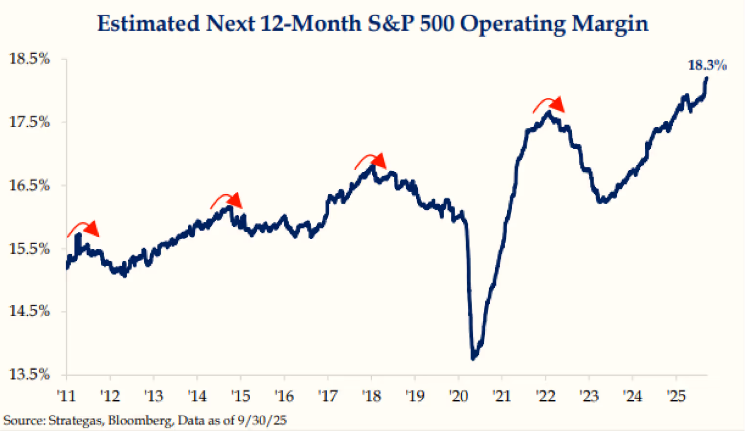 A striking data point: Nvidia’s market capitalization now exceeds that of the entire Consumer Staples, Energy, Utility, Real Estate, and Materials sectors —and is approaching the weight of the entire Industrials sector. This concentration means today’s index reflects businesses with higher profitability, stronger growth, lower capital intensity, and wider competitive moats than in prior eras. S&P 500 operating margins are nearly 300 basis points higher than they were 15 years ago, reflecting this structural transformation.