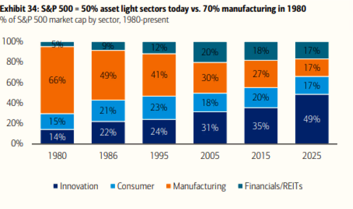 Within our firm, there is an ongoing debate about what constitutes a “fair” multiple for today’s market. The composition of the S&P 500 has shifted meaningfully. Growth-oriented technology and communication services sectors now dominate, while defensive areas like consumer staples and utilities have declined to multigenerational lows.\