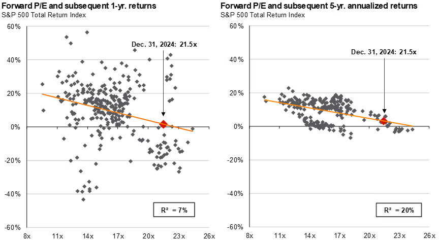 Source: FactSet, Refinitiv Datastream, Standard & Poor’s, Thomson Reuters, J.P. Morgan Asset Management. Returns are 12-month and 60-month annualized total returns, measured monthly, beginning 12/31/1999. R² represents the percent of total variation in total returns that can be explained by forward price-to-earnings ratios. Price-to-earnings is price divided by consensus analyst estimates of earnings per share for the next 12 months as provided by IBES since May 1999 and by FactSet since January 2022.Guide to the Markets – U.S. Data are as of December 31, 2024.