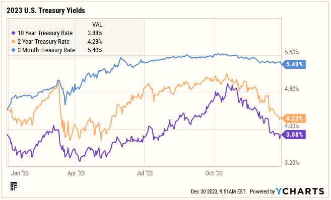 We have written extensively about how to keep cash safe and generate yield, versus a bank account: invest in U.S. Treasury Bills, Money Market Funds, or ETFs. The below chart highlights just how much one’s yield can be improved by investing in U.S. Treasuries, without any concern of a bank failure. For larger cash balances that one does not need in the coming months, extend the maturities of the cash portfolio to lock in yield. The Federal Reserve and financial markets both expect lower rates in 2024. The Fed expects 3 cuts (0.75%) in rates next year, and markets are pricing in six cuts (1.5%). As of December 29, 3-month T-Bills were yielding 5.40%, 12-month T-Bills were yielding 4.78%, and the 2-year T-Note was yielding 4.23% – implying that the market expects 12-month T-Bill rates to fall to 3.68% in a year.