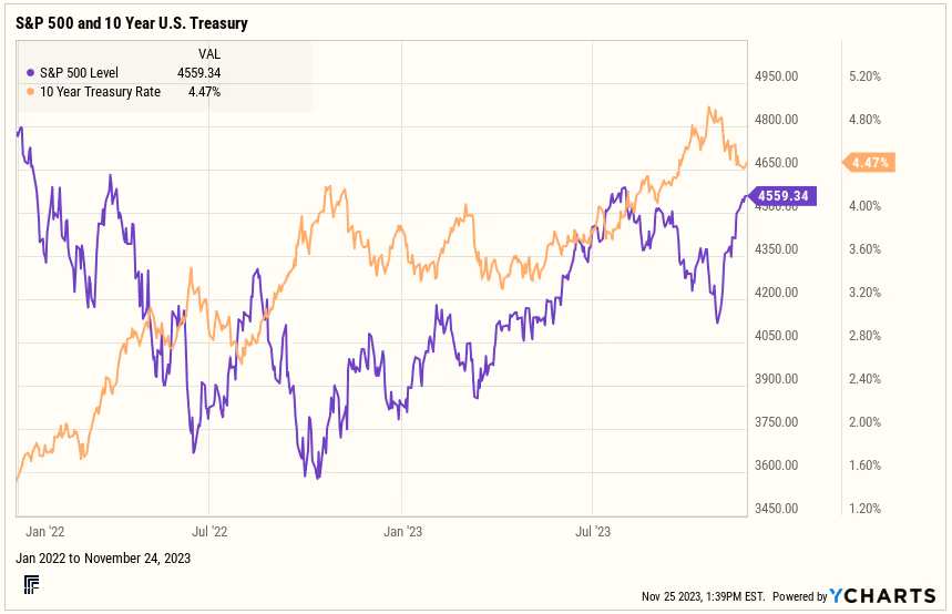The rally in stocks and bonds in late October through Thanksgiving was caused by several news events that drove long-term rates lower. Perceived dovish Fed comments, following the November 1st FOMC meeting, along with a slower-than-expected October employment report fueled the year’s strongest rally (vs other weeks). A lower-than-expected CPI report on November 14th helped stocks and bonds rally further, as the markets indicate a belief that the Fed is likely done raising interest rates.