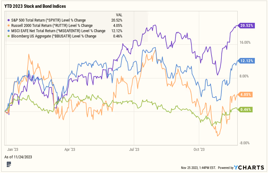 Through November 24th, the S&P 500 Index had risen 20.5% – outpacing the small-cap Russell 2000 Index, which was up 4.0%. Internationally, the MSCI EAFE Index was up 12.1%. The 10-year U.S. Treasury Note was yielding 4.47%, and the Bloomberg Aggregate Bond Index was up a modest 0.5%.